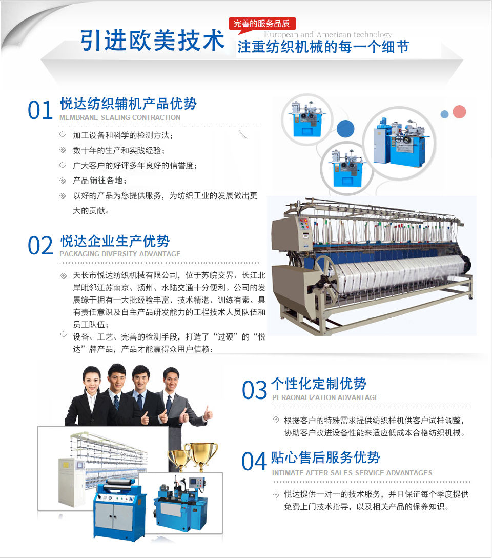 公司是主要生產(chǎn)紡織平車安裝工具、紡部輔件及配件綜合性企業(yè)。已有二十多年的生產(chǎn)歷史,在激烈的市場(chǎng)競(jìng)爭(zhēng)中始終保持優(yōu)良的質(zhì)量、優(yōu)化的價(jià)格、齊全的品種優(yōu)勢(shì)。產(chǎn)品暢銷全國(guó)各地,深受新老客戶的好評(píng)。